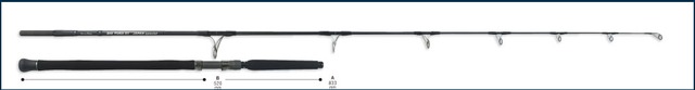 BIG TUNA 73 JAPAN Special 200kgオーバーのクロマグロを視野に入れたパワーロッドであり、ファイトも高負荷ドラグでの超持久戦を前提とした展開をメインに想定したモデル。ファイト支点を手間に設定し、ドラグ15キロを超える高負荷でも用意に長時間耐えることが可能です。得意とするのはシイラパターン時に使用する大型ルアーですが、ショートロッドでありながらティップセクションをライトに設定しているので、60gのシンキングペンシル等のキャストにも対応できます。 Target マグロ類~200kgオーバー ガイド仕様 スーパーオーシャンガイド仕様(Fuji) ドラグマックス 18kg/45° Length 7ft 3in(仕舞寸法:1515mm) Weight 406g Section 2pcs / グリップジョイント Lure 60~180g Line PE 8~12 ◎適合リール目安 S・D:18000~30000 / D:6500~8000 グリップ長 / 838mm(グリップ全長)・520mm(グリップエンドからリールフットまで) ブランク先径 / 3.6mm(トップガイド直下)・ブランク元径 / 15.1mm(元径は竿尻から915mmの釣竿本体の外径) リールシート / DPS20(Fuji)ダウンロック グリップエンド / アルミギンバル仕様