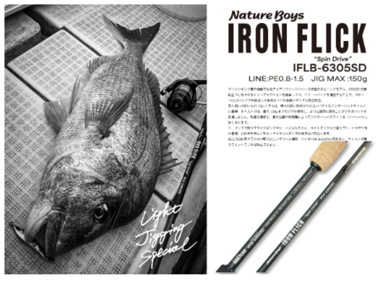 ライトジギング専用機種であるアイアンフリックシリーズ待望のスピニングモデル。6302SDの繊細且つしなやかなティップセクションを継承しつつ、ベリー~バッドを増強することで、100~120gのTGジグを使用した急流エリアの真鯛ジギングに完全対応。